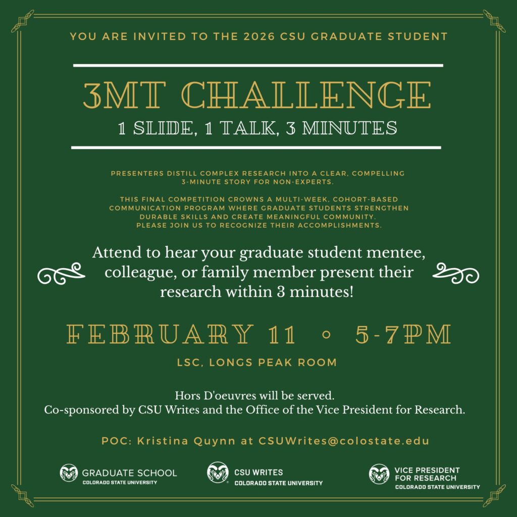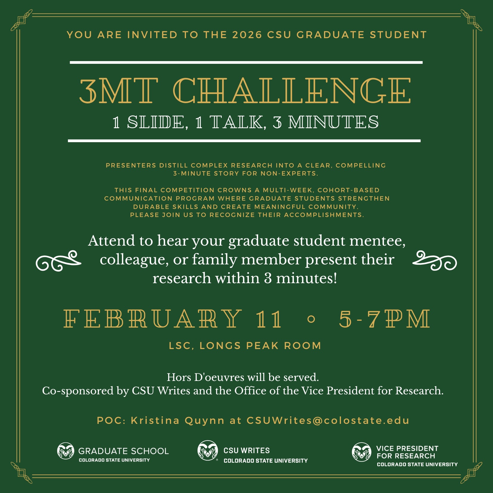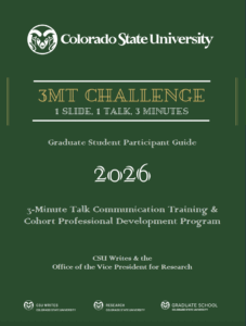 The CSU 3MT program and competition is run by CSU Writes with support from the Office of the Vice President for Research and the Graduate School.
