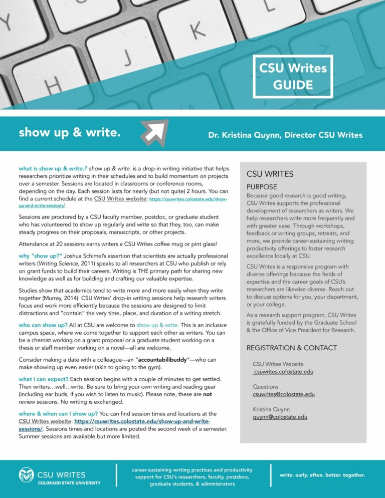show up & write. is a CSU Writes offering that helps writers “contain” their projects in time and space AND provides a writing companion to enhance focus, wellbeing, and productivity.